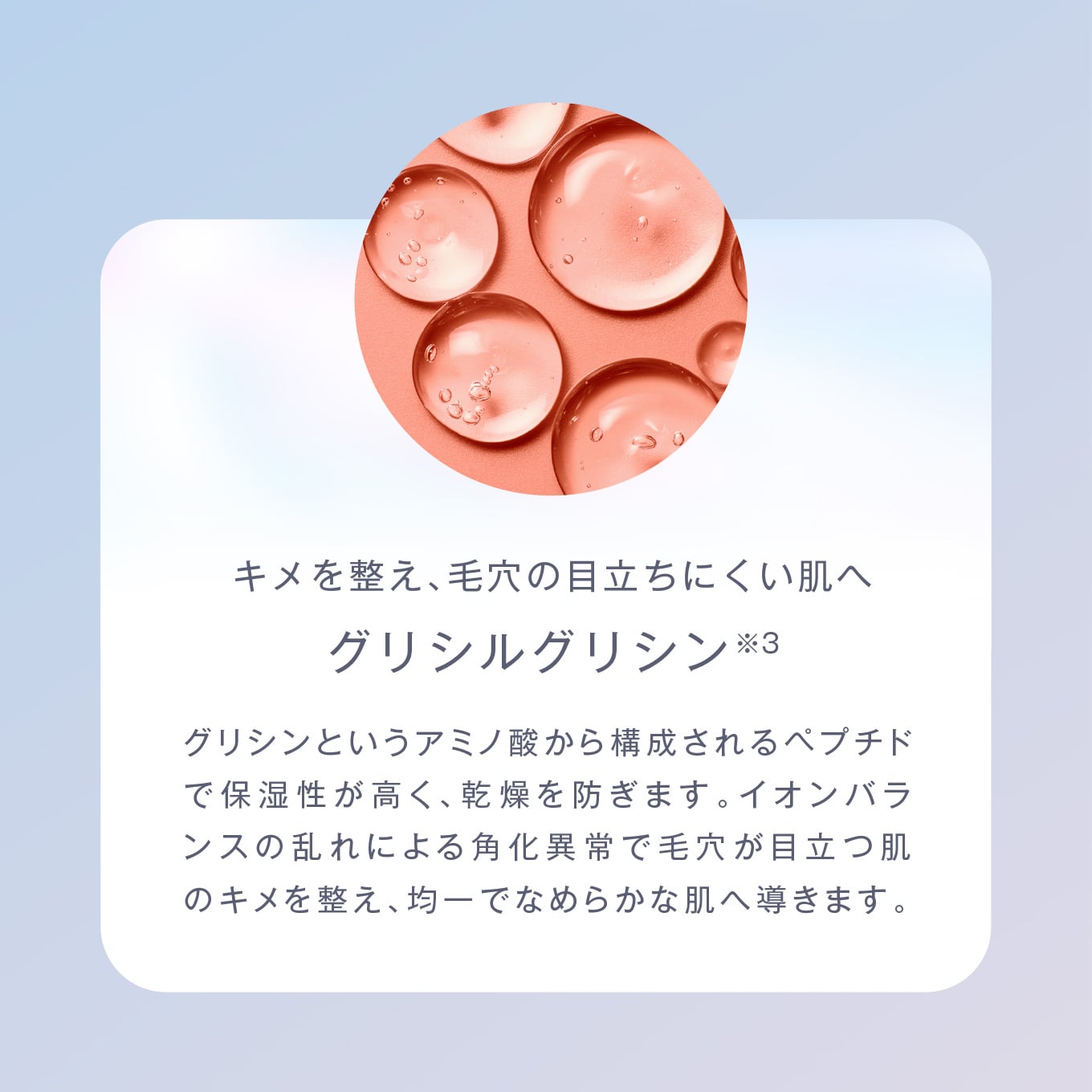 美容クリニックの最前線をホームケアに。 皮脂や毛穴トラブルが気になる肌に、3つのひきしめ成分と角質ケア成分を配合した化粧水です。高濃度※2アゼライン酸誘導体※1をはじめとする3つのひきしめ成分アゼライン酸誘導体※1、グリシルグリシン※3、ナイアシンアミド※4が肌の油分・水分のバランスを整えながら、肌をひきしめて、毛穴の目立ちにくいなめらかな肌へ整えます。マンデル酸※5が不要な角質に穏やかに働きかけ、ざらつきのない均一な美しい肌へと導きます。 ※1 アゼロイルジグリシンK、水(整肌成分)、※2 取り使い製品比において、※3 グリシルグリシン(整肌成分)、※4 ナイアシンアミド(整肌成分)、※5 マンデル酸(整肌成分) |