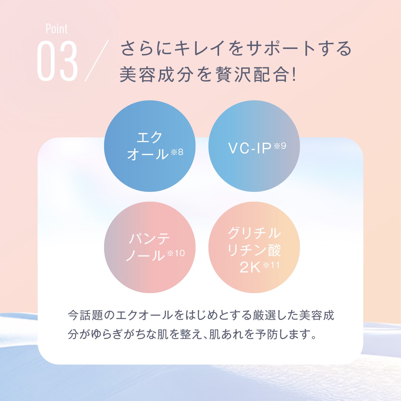 | 成分 | 水、ペンチレングリコール、BG、ナイアシンアミド、パンテノール、アゼロイルジグリシンK、グリシルグリシン、グリチルリチン酸2K、(アスコルビル/トコフェリル)リン酸K、セバシン酸、10-ヒドロキシデカン酸、1,10-デカンジオール、アラントイン、テトラヘキシルデカン酸アスコルビル、トロメタミン、マンデル酸、DPG、PEG-32、PEG-75、EDTA-2Na、PPG-6デシルテトラデセス-30、エクオール、PEG-60水添ヒマシ油、クエン酸、クエン酸Na、フェノキシエタノール、1,2-ヘキサンジオール |